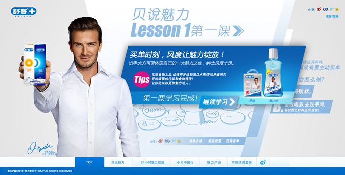 舒客——美容級口腔護理品牌,致力于高端美齒護理市場,以創(chuàng)新科技提升美齒標準,讓美容不止于妝容,美容從“齒”開始!產品包括牙膏類、口腔護理工具類和兒童護理類。其中,益早益晚系列牙膏在國內首次提出“早晚分護”概念;舒客寶貝,是國內首款食品級的兒童牙膏產品,深受消費者的好評。2011年4月,舒客簽約國際巨星大衛(wèi)?貝克漢姆為形象代言人。2014年6月,國際巨星李冰冰正式接力貝克漢姆成為舒客新的形象代言人,引領舒客魅力風尚。