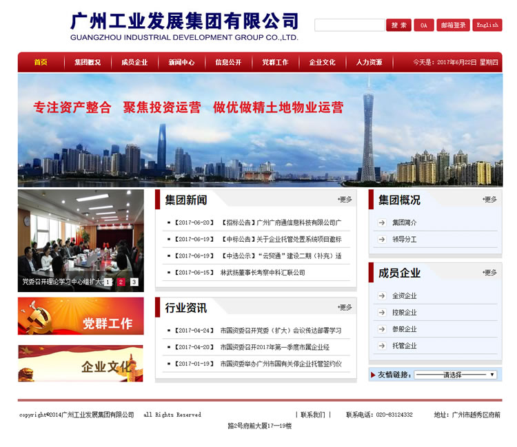 簡介:工業(yè)發(fā)展集團成立于1995年,是廣州市國資委直屬的國有獨資企業(yè)。集團公司作為廣州市國有企業(yè)資產重組、結構調整、盤活資源、理順關系的重要平臺,為推進市屬國有經濟布局、結構調整和深化國有企業(yè)改革服務。Official Webeite Addess