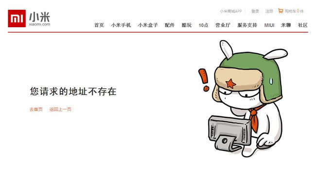 我們先來看一下在手機(jī)銷售行業(yè)一枝獨(dú)秀并憑此獲得中國2012年度經(jīng)濟(jì)人物獎的雷軍的小米。這就是小米手機(jī)官網(wǎng)的404頁面,很普通,一個圖片,一句“您請求的地址不存在”,兩個選項“去首頁”或者“返回上一頁”就完事了。與小米手機(jī)的別出心裁來比真是有點(diǎn)讓人失望呢!