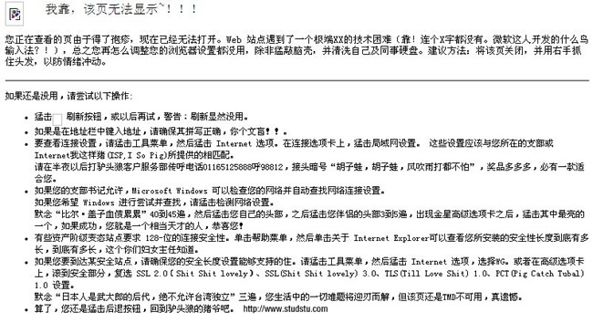 不知道大家有沒有看到過這個。是筆者一次在一個站長網(wǎng)無法打開時所顯示的404頁面。與其他網(wǎng)站的404頁面不同,它既沒有圖片頁面好看,也沒有直截了當(dāng)?shù)奶崾,再看其?nèi)容,具有很濃重的星爺?shù)奈阈︼L(fēng)格,如果你真的按照它所說的去做,你就傻了。如果剛開始接觸互聯(lián)網(wǎng)的人看到這個頁面,估計它的電腦和身邊的人都得遭殃了。筆者為什么要放這么一個404頁面上來,因為它能夠徹底改變我們眼中程序員的“木訥”“枯燥無味”之類的看法,而且它的語言表達(dá)風(fēng)格很有年輕一代的特色,可以說是一個時代的特征之一。