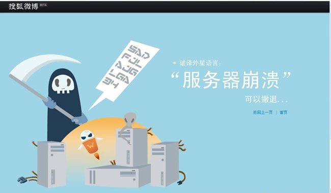 這個是搜狐微博的。可謂是意外的發(fā)現(xiàn),早上點(diǎn)微博的時候出現(xiàn)的。真是充滿了中國神話的色彩,一方面用死神代表服務(wù)器出現(xiàn)了問題,另外一方面用一堆看不懂的符號來表示外星語言,旁邊加上注釋“服務(wù)器崩潰,可以撤退……”碰上這兩個家伙,真是應(yīng)當(dāng)馬上撤退呀!