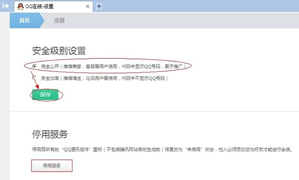 2、點擊“設置”按鈕,選擇安全級別為“完全公開”,保存。此時QQ客戶就會恢復在線狀態(tài),可以接收來自網(wǎng)頁上的臨時會話。請留意下面“停用服務”按鈕,如果點擊此按鈕,將會停止所有的網(wǎng)頁QQ在線服務,因而如果要停用某個網(wǎng)頁的QQ在線服務,可以點擊此按鈕。