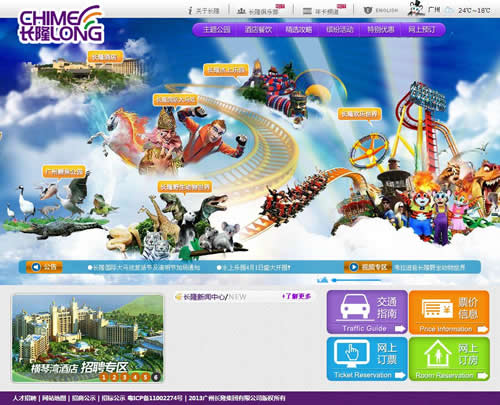 在展示方式上面,我們可以參考一些比較大型的旅游景點(diǎn)或度假村的展示方式。如著名的廣州長(zhǎng)隆歡樂世界,其首頁(yè)就使用了大型的動(dòng)畫設(shè)計(jì),用栩栩如生的動(dòng)畫來(lái)作為每個(gè)景點(diǎn)的導(dǎo)航,輔以明快的色調(diào)搭配以及特效設(shè)計(jì),不但整體展現(xiàn)上很吸引人,而且一目了然的設(shè)計(jì)也讓瀏覽者能夠快速查找到目標(biāo)欄目及信息。